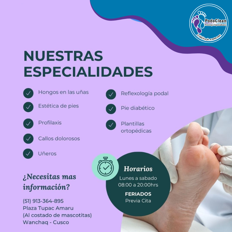Corte y cuidado de uñas. Tratamiento de callos y durezas. Atención a problemas dérmicos. Estudio de la pisada. Plantillas ortopédicas personalizadas. Tratamiento de pie diabético. Masajes podales y reflexología.